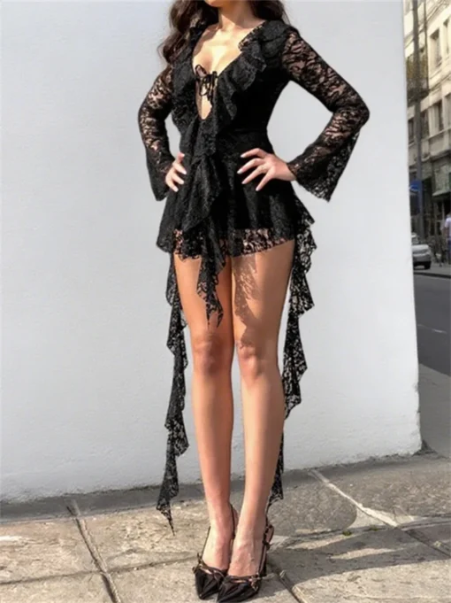 Women Eyelet White Dress Long Sleeve Deep V Neck Lace Patchwork Dress Autumn Casual Bohemian