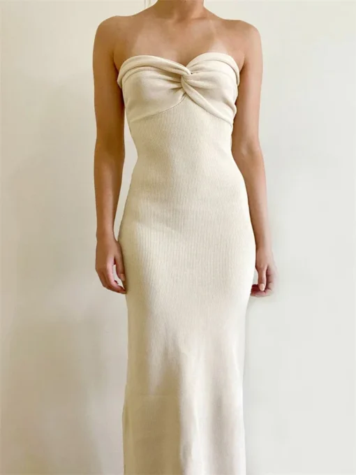 Women Party Long Dress Solid Color Tube Dress Summer Fashion Backless Casual Strapless Pleated Dress with Choker Scarf