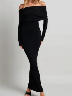 Women’s Long Fitted Evening Dress Black Long Sleeve Off Shoulder Strapless Party Dress